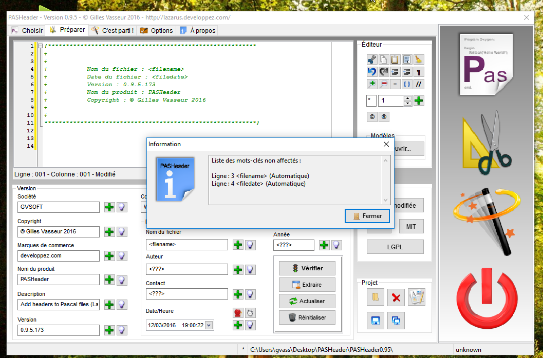 Entièrement écrit en Pascal à partir de Lazarus, le programme fonctionne sous Linux et Windows, en anglais ou en français. En plus du code source, le projet est livré avec un document de prise en main comprenant trois tutoriels, des exemples de modèles d'en-têtes et un tutoriel filmé. En bonus, à titre expérimental, PASHeader existe en version intégrable à l'EDI.
