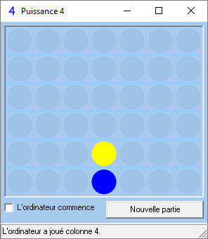 L'intérêt de ce programme réside, d'une part, dans l'utilisation du composant TStringGrid, qu'on a détourné de sa finalité initiale, pour en faire une grille de "Puissance 4". La propriété DefaultDrawing a été réglée à FALSE, de sorte que le dessin des cellules est intégralement effectué par la méthode Redessiner. Par ce moyen on se débarrasse du carré en pointillés qui d'ordinaire marque la cellule sélectionnée. En contrepartie, il faut dessiner même les cases vides.