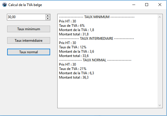 L'exemple complet est une application traitant le calcul de la TVA belge (image 1).