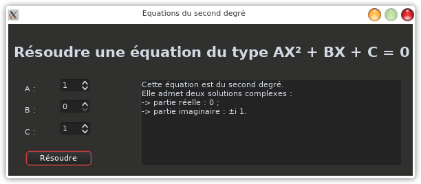 L'exemple d'application résout une équation du type AX² + BX + C = 0.