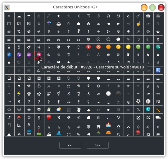 L'application d'exemple est un petit utilitaire affichant, par blocs de 256, tous les caractères Unicode au format UTF-16, avec la possibilité de copier l'un d'entre eux dans le presse-papier (image 1).