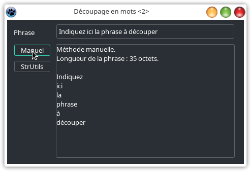 L'application d'exemple découpera une phrase en mots ; l'utilisateur aura le choix entre un découpage programmé à la main et un découpage assisté par les routines de l'unité StrUtils (image 1).
