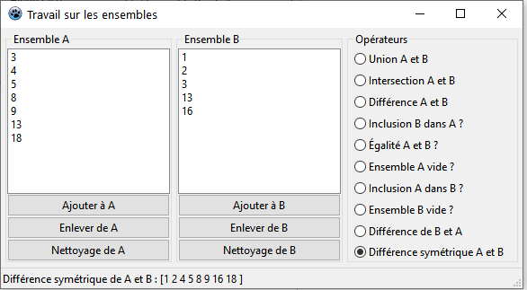 L’exemple proposé pour l’illustration des ensembles permet de gérer deux ensembles d’entiers et de leur appliquer les différents opérateurs. C'est aussi l’occasion de travailler avec les boutons radio et les boîtes listes (image 1).