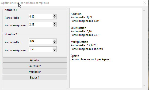 L'exemple d'application permet de créer des nombres complexes et de leur appliquer des opérations mathématiques.