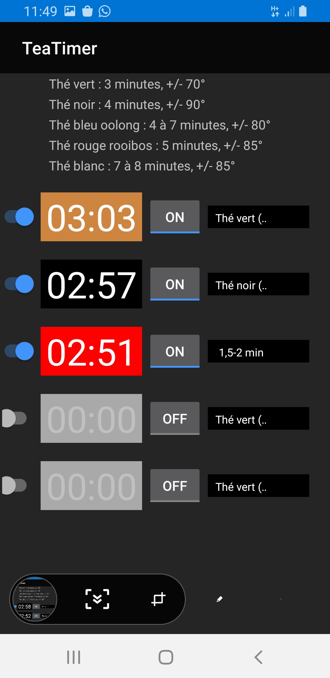 Cette petite application permet de chronométrer le temps d'infusion de votre thé. Il est possible de chronométrer jusqu'à 5 thés simultanément. Selon le thé choisi, l'application enverra un signal sonore et visuel dès que le temps minimal d'infusion puis le temps maximal seront atteints.