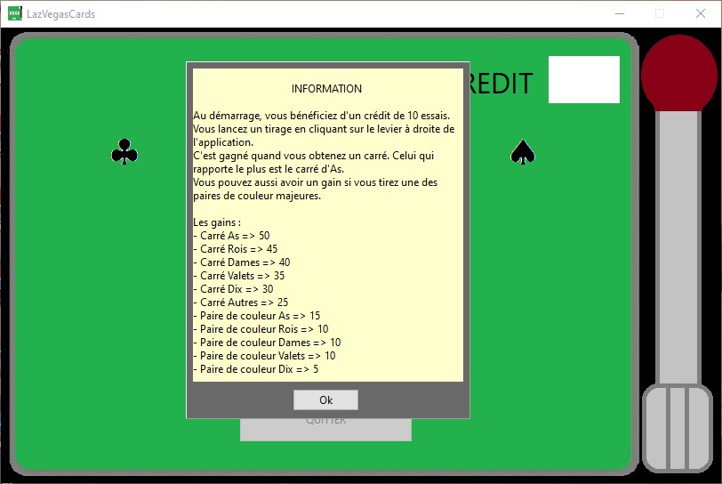 Petite application de jeu de bandit manchot pour Windows développée avec Lazarus et utilisant la bibliothèque cards.dll de Microsoft.