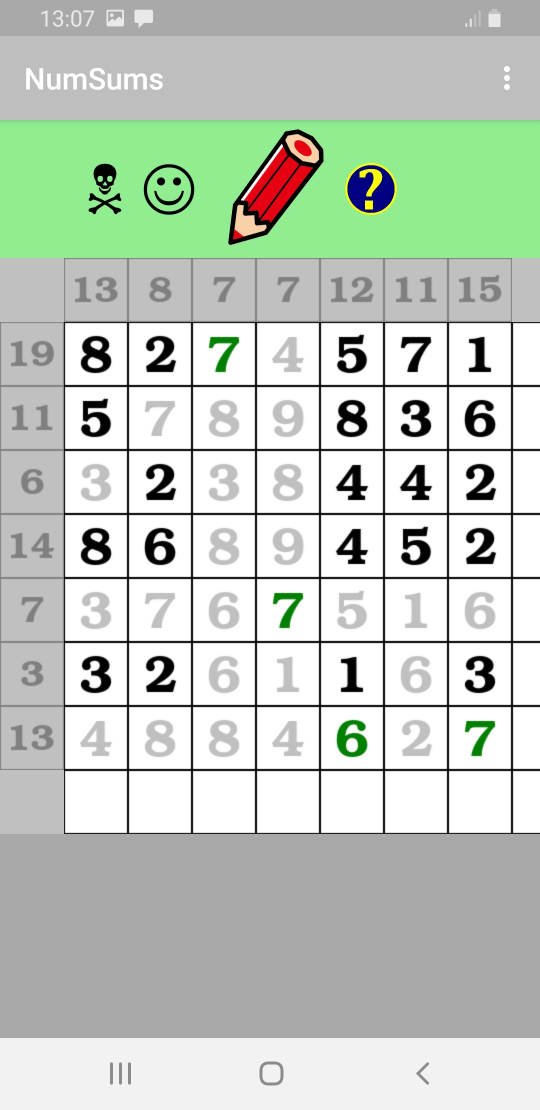 Dans une grille (3 niveaux : 6x6, 7x7 ou 8x8), il faut trouver les nombres dont la somme donne les totaux des lignes et des colonnes. À l'aide du crayon, vous sélectionnez un nombre, tandis qu'avec la gomme vous l'effacez. Attention que vous ne pouvez faire qu'une seule erreur ! Pour basculer entre le mode "crayon" et le mode "gomme", il suffit de presser l'image dans la barre supérieure.